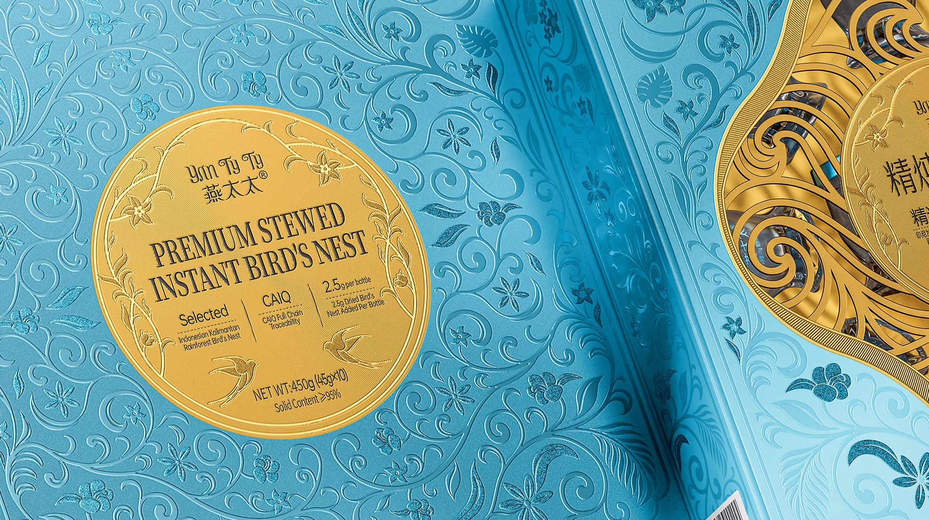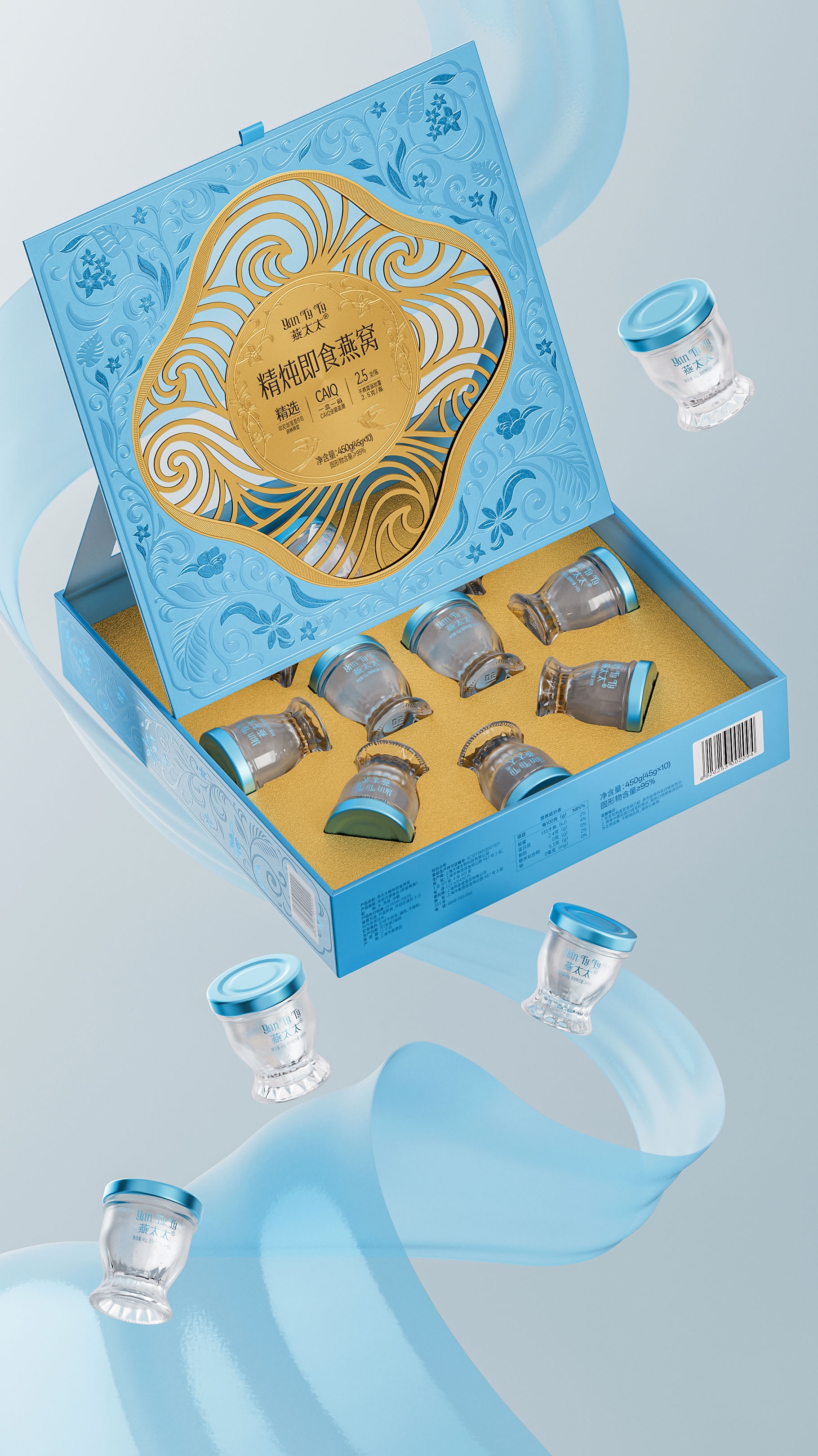 功能細節(jié)上,瓶身采用食品級水晶玻璃與氮氣鎖鮮工藝,確保燕窩品質(zhì);瓶底拋光切面,在光影下折射出琥珀色光澤,暗合傳統(tǒng)滋補文化的貴重屬性。