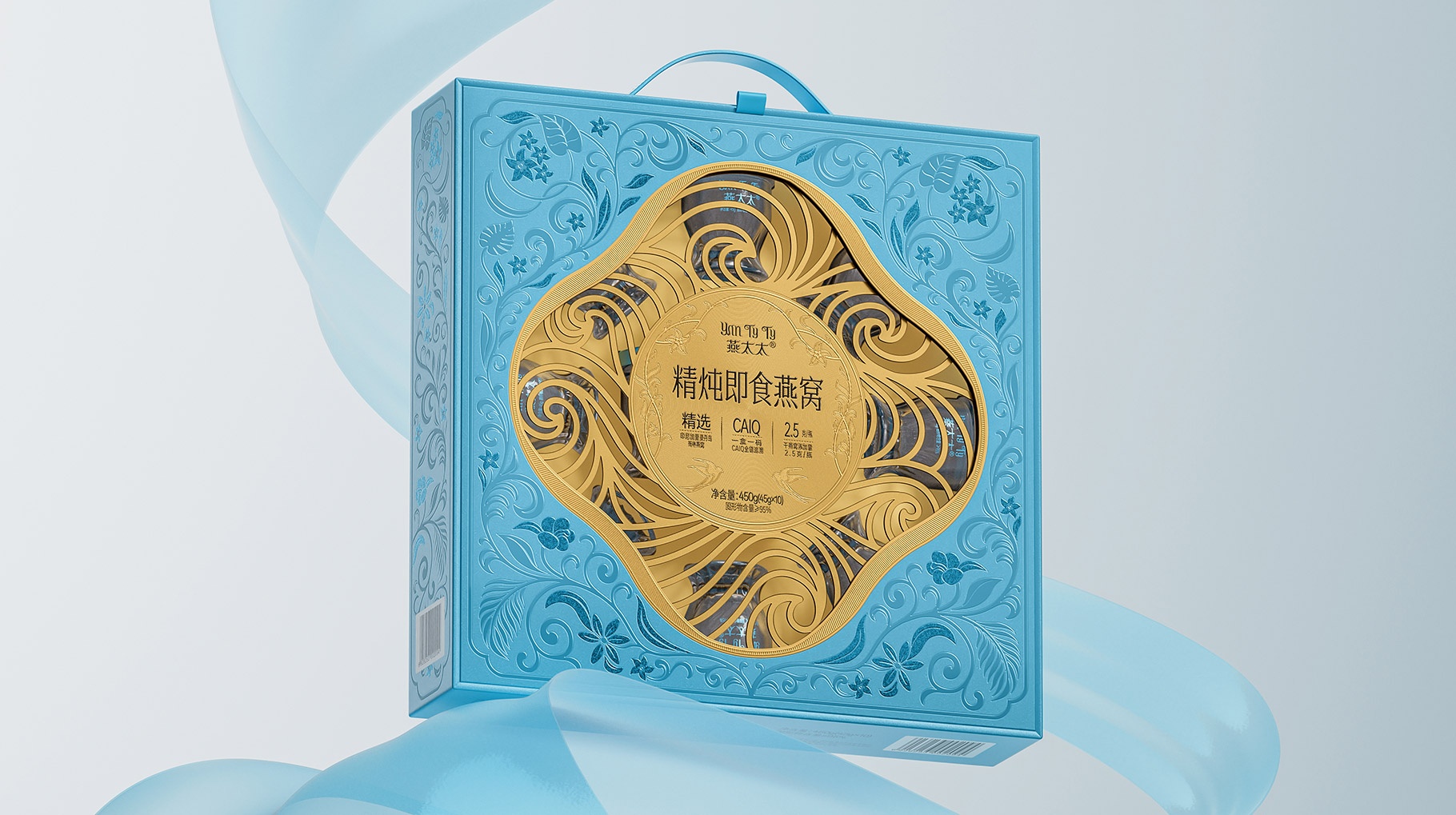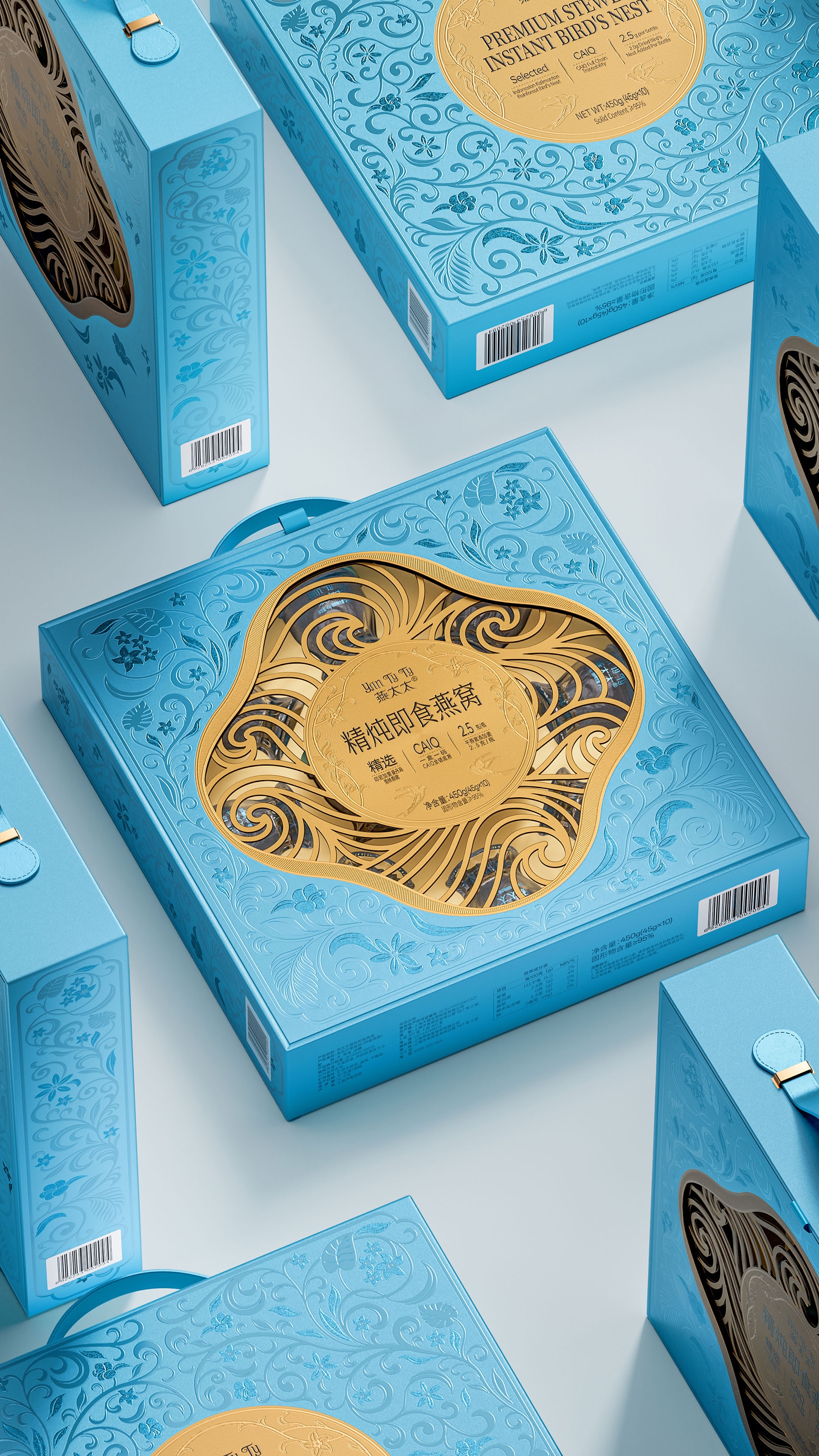 整體包裝創(chuàng)意以獨創(chuàng)三層視覺敘事:中部采用東方園林“框景”手法打造鏤空視窗,湖藍色藤蔓紋樣層疊延展,再現(xiàn)雨林生態(tài)的呼吸韻律,虛實交錯間透現(xiàn)燕窩瑩潤質(zhì)感。