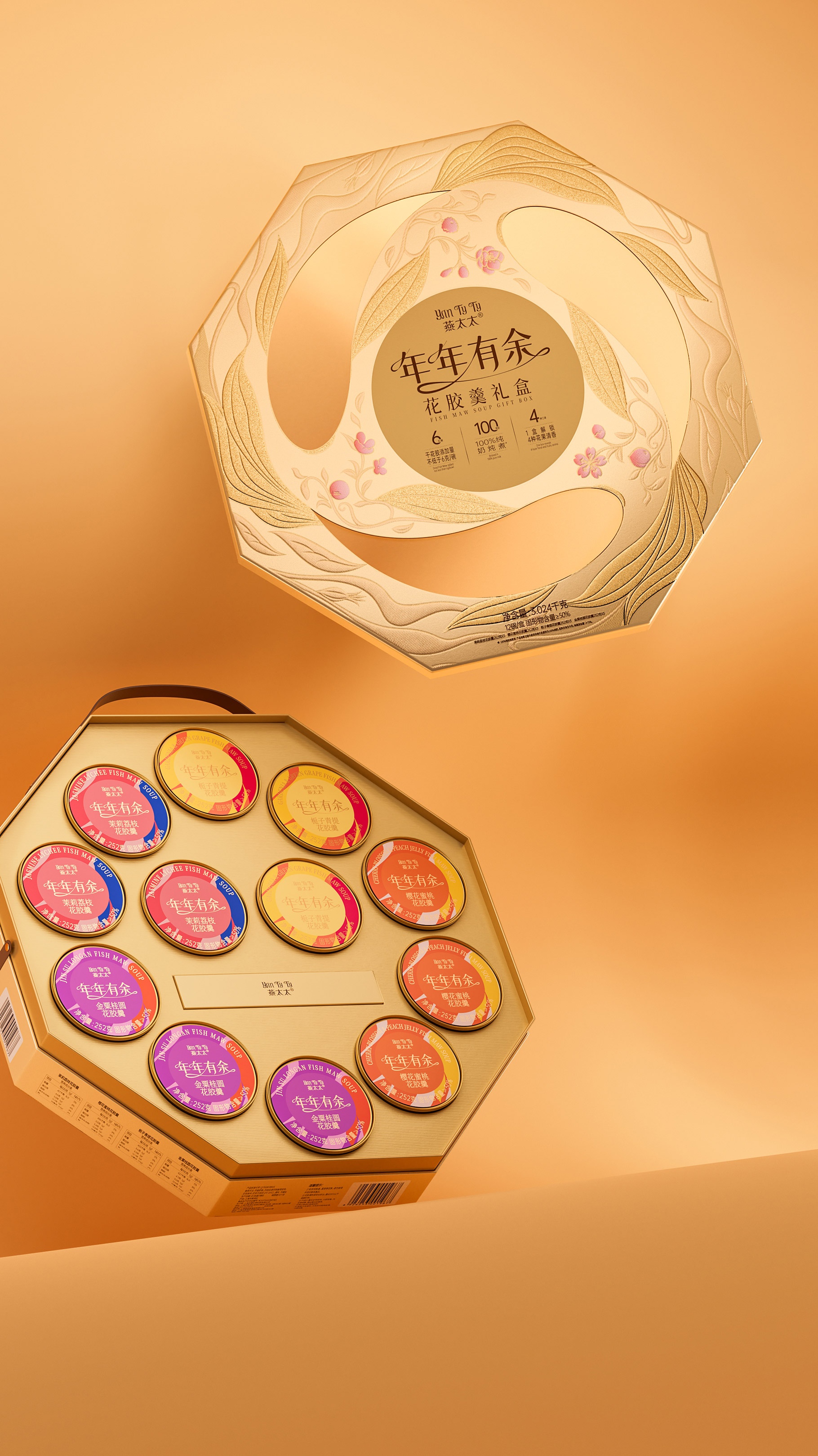 燕太太為山姆會員店精心專供的新年花膠羹禮盒產品,團隊在思考新年禮盒產品的時候,旨在通過一款獨特而富有深意的包裝設計,傳達出對美好未來的期許與祝福。此設計以“年年有余”為主題,巧妙融合魚與不同口味主題花卉的元素,通過完美旋轉的圖案創意,打造出一款既體現傳統韻味又不失現代美感的新年花膠羹禮盒。